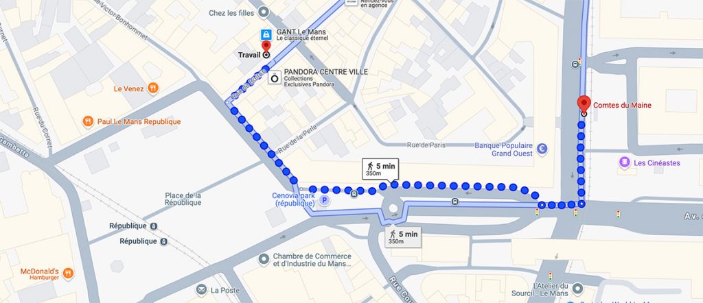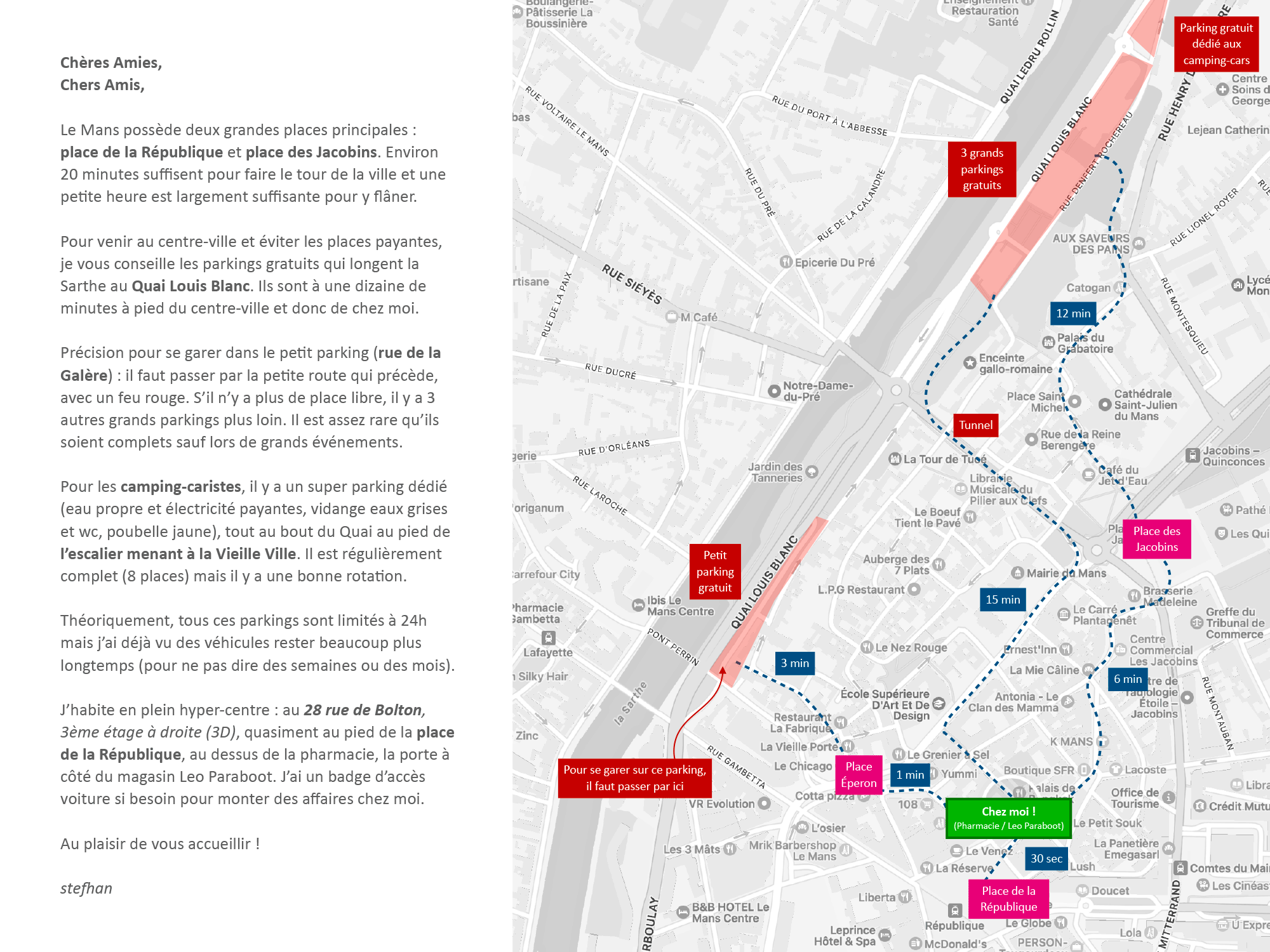 Pour venir au centre-ville et éviter les places payantes, je vous conseille les parkings gratuits qui longent la Sarthe au Quai Louis Blanc. Ils sont à une dizaine de minutes à pied du centre-ville et donc de chez moi.
