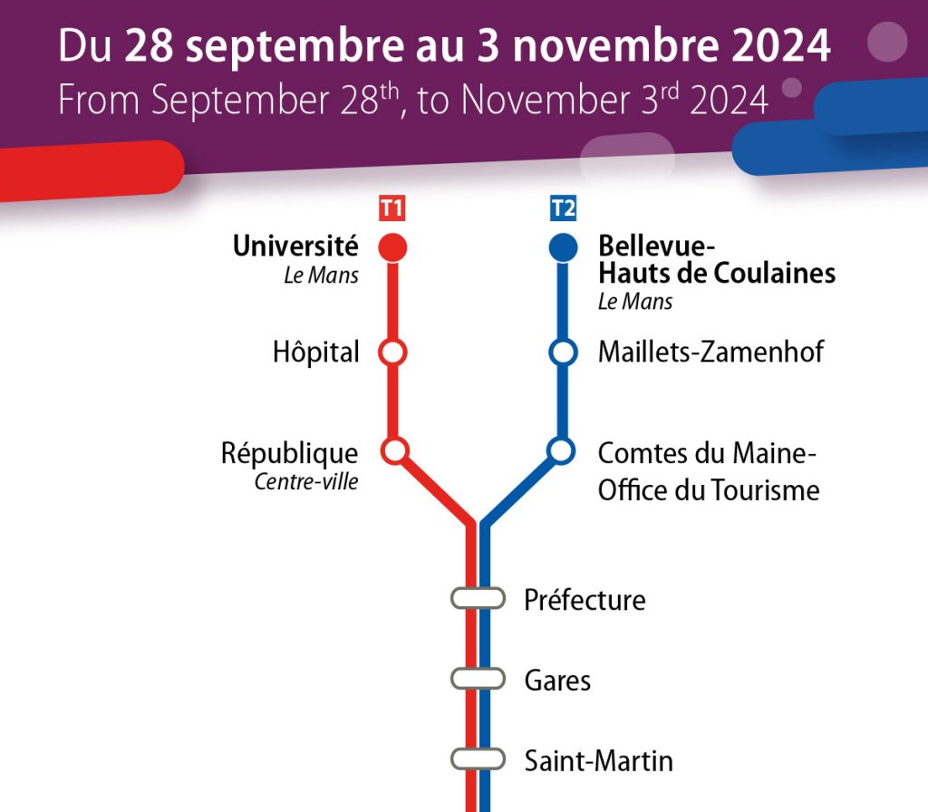 Depuis la Gare du Mans (sortie Nord), prendre le tram direction T1 Université, descendre « Place de la République« .